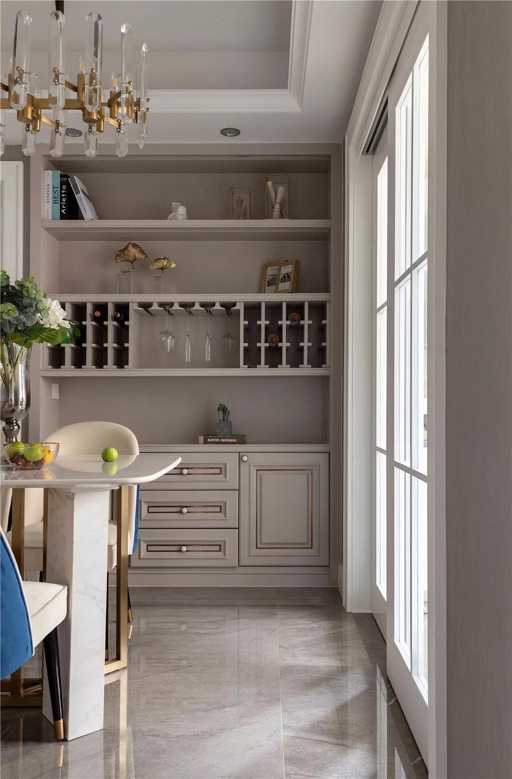 在全鋁餐邊柜的開放擱架上直接擺上紅酒瓶