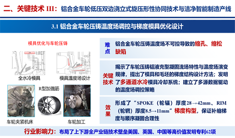 三是發明了鋁合金車輪低壓雙邊澆立式旋壓新方法,突破了形性協同導向的鋁合金車輪壓鑄智能溫控模具優化技術,構建了鋁合金車輪潔凈切削自適應工藝策略與智能檢測產線,提升車輪抗拉強度、延伸率,降低夾渣報廢率。